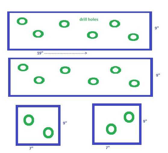 Con su cortador de agujeros de taladro y 1" perfore los orificios de ventilación de 4 a 6 en cada uno de los lados de 19" y 1 o 2 en los lados de 7".