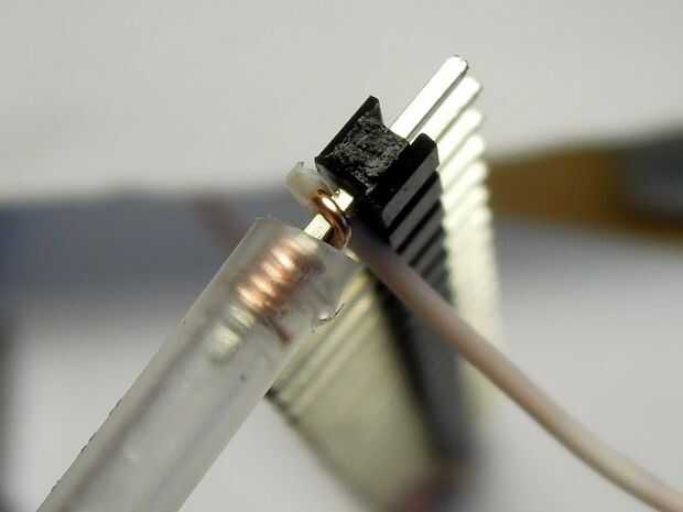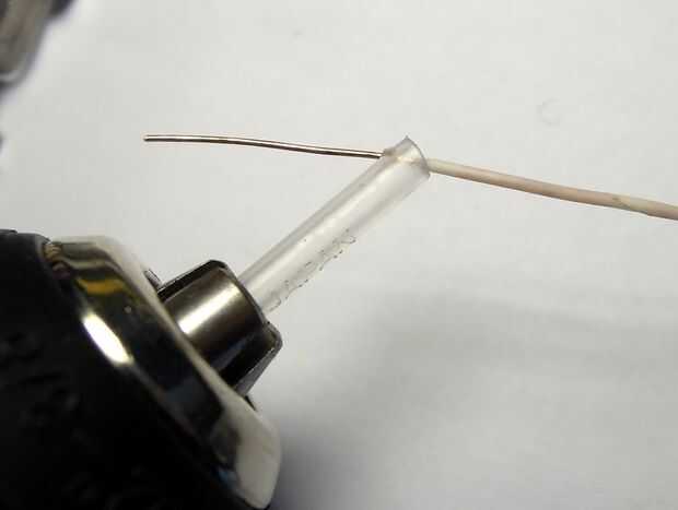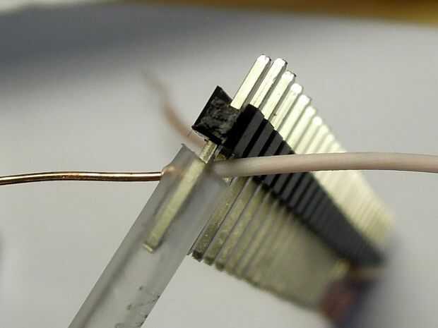 Pasar el cable pelado (alrededor de 1 de largo para calibre 24 en pin 2,54 mm espaciado) a través del orificio que perforado de dentro del tubo al exterior. Asegúrese de que algunos de la parte aislada es en el tubo.