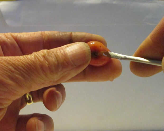 1 Sostenga la cereza en una mano con el pulgar, índice y dedo medio. Inserte la herramienta cerca de la zona de tallo y deslice hacia abajo a lo largo del hoyo de la cereza.