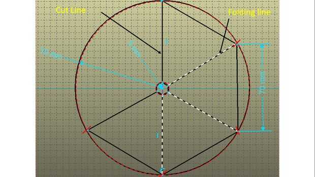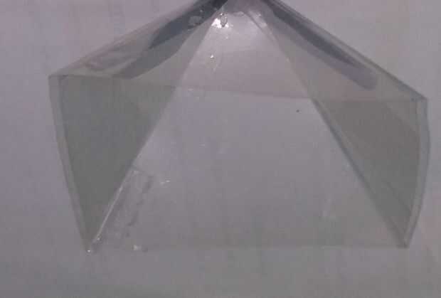 Dibujar la plantilla en una hoja transparente (siga la siguiente instrucción video). Es la plantilla de una pirámide cuadrada de la longitud de lado de base 7cm que consta de sólo 4 flanco sin base. Cortar con una tijera a lo largo de la línea exterior. Doble a lo largo de la línea de doblado 3. Después de tres veces se completará la pirámide. Pegar los bordes de dos extremos con una cinta de cello. La plantilla es tal que el vértice superior fue cortado para darle una tapa plana.