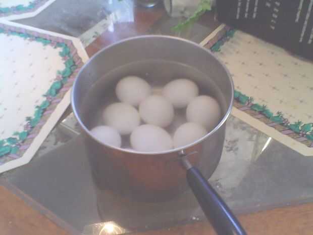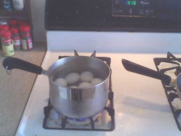 Lavar huevos bajo el agua. Poner los huevos en una olla lo suficiente como para llenar la parte inferior. Cubra los huevos con agua. Poner la cacerola en la estufa sin cubrir. Encienda ese quemador a fuego alto para que los huevos pueden hervir.