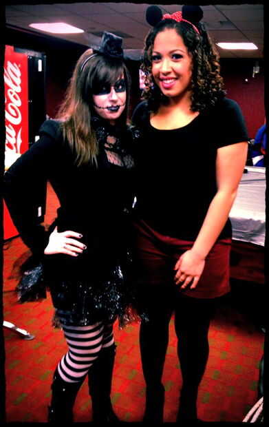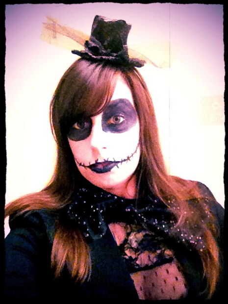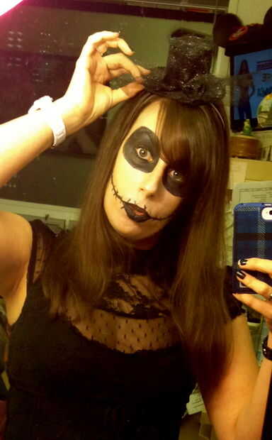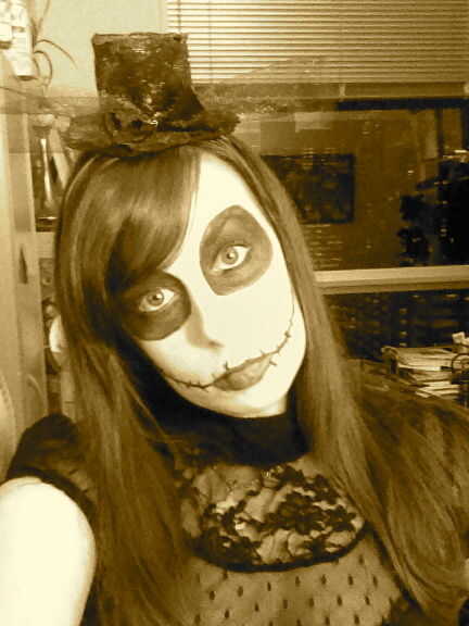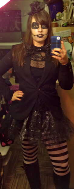 con bateo de manta, tela de algodón, tul, pegamento caliente, brillo y una diadema que hice un sombrero pequeño corriendo. Hice un tutu con tul brillo y elástico y corte un lazo brillante con organza de la chispa. El resto pongo junto con artículos que tenía: medias de rayas, un top de encaje encorsetado de tema, botas y una chaqueta negra de cuero. Y por último, utilizando blanco y negro de sombras de ojos y delineador de ojos líquido negro, pinta mi cara al parecer Jack Skellington de pesadilla antes de Navidad :)