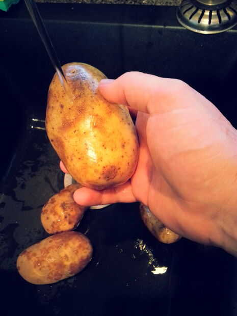 Frote tus papas bajo el grifo y cortar cualquier bits antibarro. Apuñalar a cada papa con un tenedor unas cuatro veces y péguelos en un plato apto para microondas. Meter la placa en el microondas durante aproximadamente un minuto por patata más dos minutos: en este caso 4 + 2 = 6 minutos. Tiempo de cocción variará dependiendo de la potencia de microondas usted y el tamaño de las patatas. El objetivo no es cocinar las papas bien, sino para ablandarlo un poco.