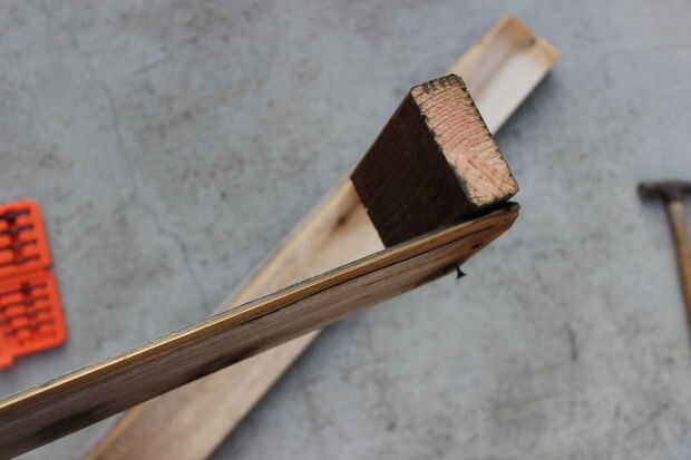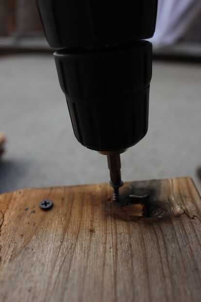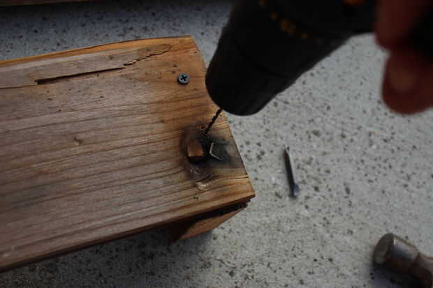 Taladre agujeros guía antes de atornillar, colocar los tablones para el lado de 2" de 2 x 4 con dos tornillos al ras con la parte inferior. Repita este proceso para los otros 2 x 4 y otro tablón.