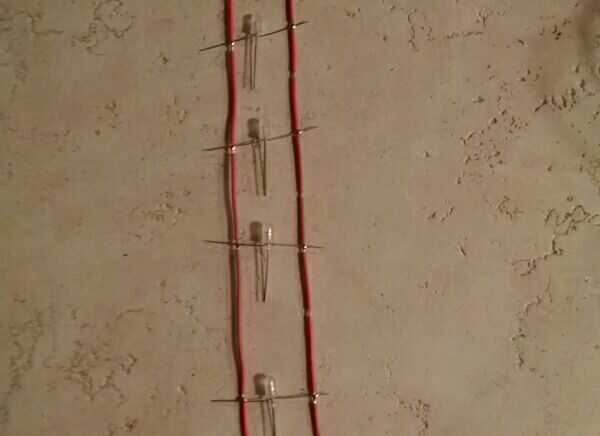 Ayuda a la corbata en la mano para esta parte, medida/aproximar la distancia desde la parte superior a inferior de la corbata. Corte 3 pedazos de alambre a esta longitud, o un poco menos; Estos se utilizarán como un terreno y 2 carriles de la energía. El ánodo y el cátodo del recto de los LED de la curva y en los rieles de 3 cables en el patrón deseado. Marque los cables donde los cables hacen contacto y tira en las marcas.