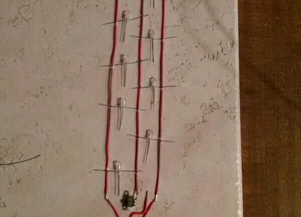 Lugar el cableado y la soldadura 9 LED del pelado los cables, mantenga en mente el alambre central es negativo. Soldar el LED y prueba antes de pasar.