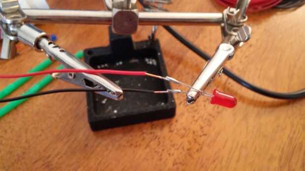 A continuación vamos a soldar a lo LED. En la foto que estoy usando un par de ayudar a las manos (las cosas de la pinza de cocodrilo) para mantener todo en su lugar así que puedo centrarme en la soldadura, pero si no tienes un par útil (valga la redundancia), puede o bien pídale a un amigo o ser creativo. ADVERTENCIA *** soldar hierros están calientes. Ser creativo con cuidado.