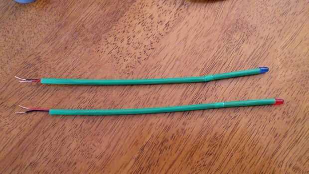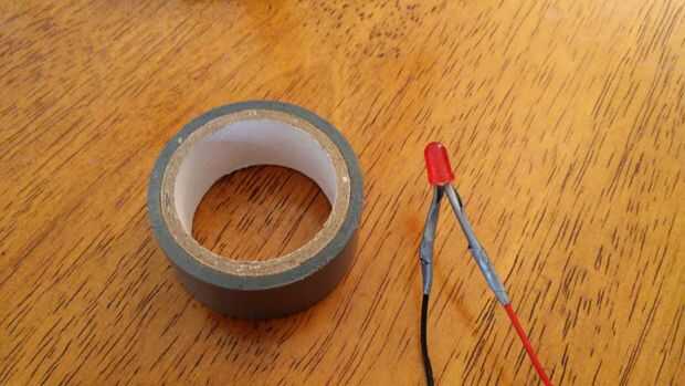 La pata más larga del LED es el lado positivo y la pierna más corta es negativa, esto es importante como el LED no funciona si es la manera incorrecta alrededor. No queremos estas patas para tocar dentro de la varita, así terminando les en cinta eléctrica es una buena idea (ver fotos), o puede usar abrigo del encogimiento del calor si lo tiene.