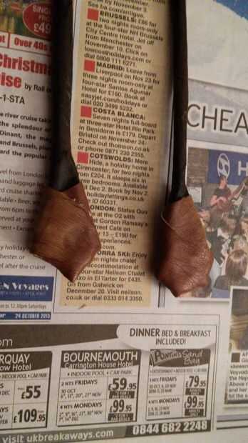 Para cubrir los cables expuestos, he utilizado tiras de cuero de un bolso viejo, pero hará cualquier tira de material. Asegúrese de que el cable positivo es cerca de la superficie de la batería (puede tardar algún ensayo y error para conseguir la posición correcta) y pegar las tiras alrededor del extremo cuidadosamente.