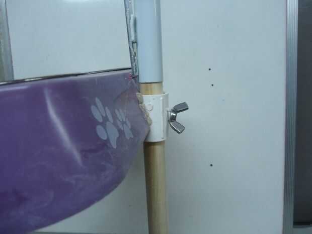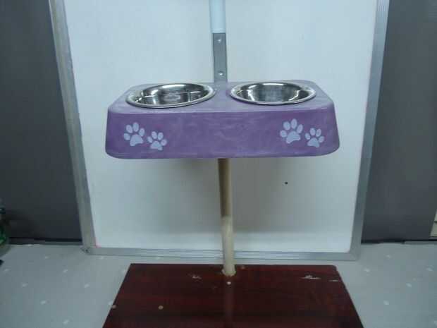 Esta idea es fácil llenar los tazones de fuente del animal doméstico. Esta innovación no es sólo para personas que tienen problemas de flexión hasta el suelo debido a la edad, lesiones de espalda, sino para todos los dueños de mascotas. La bandeja del tazón de fuente está conectada a un tubo hueco a través de un soporte en L y un collar con tornillo de mariposa de ajuste. El tubo se desliza arriba y abajo de la varilla de pasador sujetando la parte superior de la tubería y levantando hacia arriba. La tubería tiene un cuello en la base con un tornillo mariposa. El tornillo regula la tolerancia entre la varilla de pasador y tubería para que el tazón de fuente bandeja no se deslice hacia abajo durante el llenado de los tazones de fuente con agua y alimentos. El tornillo se ajusta sólo un par de veces una vez lograda la tolerancia correcta. Nota: Esta idea es para hacer el relleno de los tazones de fuente del animal doméstico. más fácil. Puede añadirse un collar flotante libre adicional con tornillo de mariposa en la parte inferior de la varilla de pasador en el cuello que se sujeta a la bandeja para ajuste de altura.