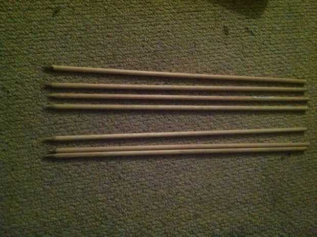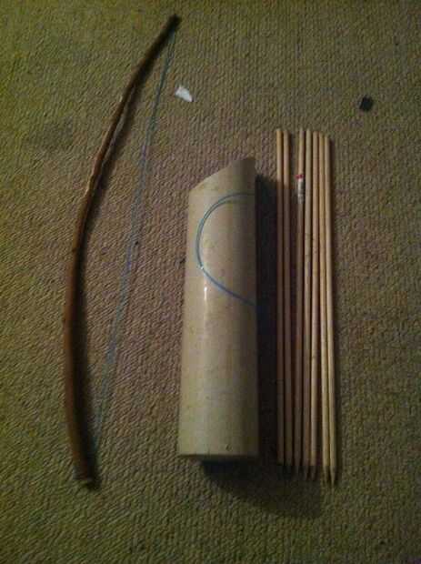 este es mi arco con el carcaj y flechas y un arco decente la aljaba está hecho de tubo de PVC con un enchufe en la parte inferior el arco I un palo con cuerda de raqueta de tenis y las flechas son tacos de madera de 9 mm para votar por mí.