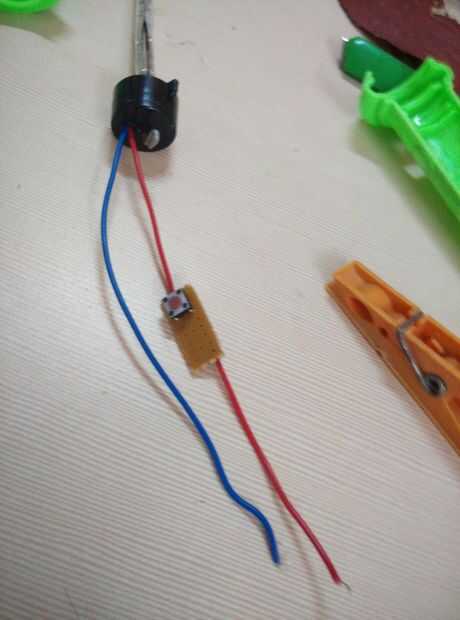 paso uno:Diagrama de la célula Solar y la soldadura de las piezas requeridas en la célula solar. (Foto 2)Soldar dos cables a la célula solar en las conexiones para el motor. Uno para positivo, uno para el negativo. Estas se utilizarán para la luz LED