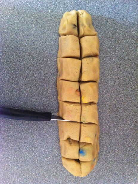 Rodar la masa para galletas en un registro uniformemente tamaño largo grueso y rebanada en 16 pedazos y luego hacerlas rodar en bolas.