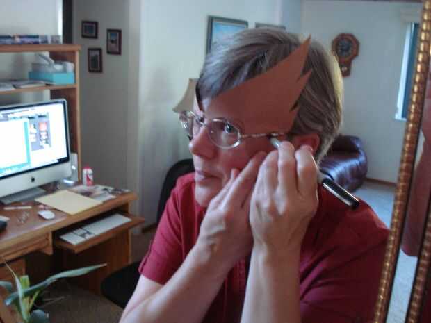 2. Corte la plantilla. Mientras que frente a un espejo, deslice la plantilla detrás de sus gafas, estirando los lados hacia abajo a lo largo de sus templos para que la plantilla esté apoyado en el puente de su nariz y se lleva a cabo en lugar por los templos de sus gafas. ¿Cómo es la apariencia? ¿Las piezas de mejilla extender demasiado lejos hacia adelante o no lo suficiente? ¿Necesita cortar más espacio alrededor de los ojos, o hacer más pequeña la zona? ¿Es la máscara de golpes en los oídos? Decidir qué cambios necesita hacer.