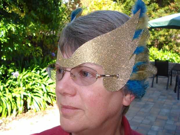 5. decore su máscara. Usé plata de espuma de la diversión de una máscara y adhesivo oro papel para el otro. Yo cuidadosamente hacia atrás los bordes del papel del forro del papel de la etiqueta engomada y coloca las plumas en el borde de la máscara y presiona el papel del forro en su lugar. Todos los materiales para dos máscaras, no incluyendo el papel de construcción que tenía en casa, cuesta unos $10,00.
