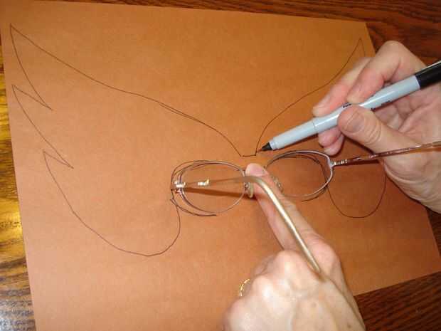 1. Coloque el lente de los vidrios sobre el centro de un pedazo de papel de construcción. Puede que desee dejar las lentes descansar sobre un trozo de tela para evitar que se raye. Trace una línea alrededor de las gafas con un lápiz o pluma. Crear una forma para su máscara a partir de la línea superior de tus lentes, incluyendo un área no más delgados que 1/4" sobre la punta. Extender los lados de la mascarilla hacia abajo por debajo de la parte inferior de sus lentes y curvando en bajo las lentes un poco.