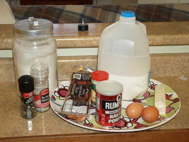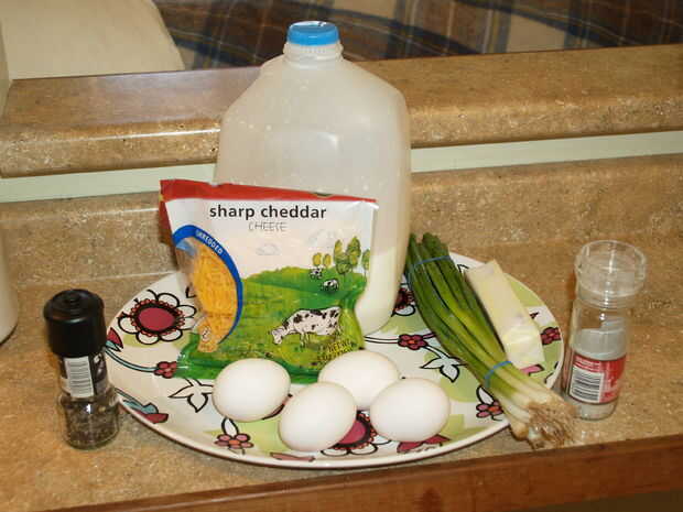 Foto 3: Los ingredientes para el queso Cheddar/cebolla de verdeo huevos revueltos: huevos, cebolla de verdeo, queso cheddar fuerte, leche, mantequilla, sal y pimienta
