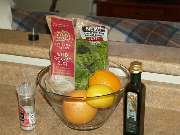 Foto 2: Los ingredientes para la ensalada de rúcula con segmentos de cítricos: mezcla verde de rúcula, naranja, pomelo, limón, aceite de oliva y sal