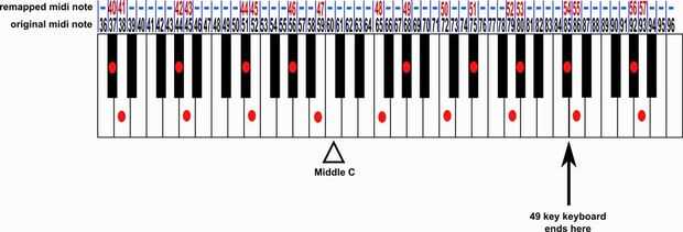 Si tiene mal funcionamiento notas en el teclado puede cambiar notas midi que utiliza para la conversión. Por ejemplo F baja puede ser C o E en lugar de D.