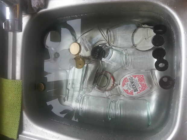 Ponga todos sus tarros en un fregadero lleno de agua con el esterilizador de agua fría hizo las instrucciones en la botella. Ten en cuenta que bien puede necesita frascos más de lo que crees! Asegúrese de que están completamente sumergidas y reposar un mínimo de tiempo del recomendado.