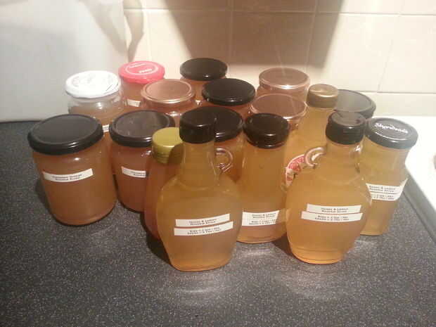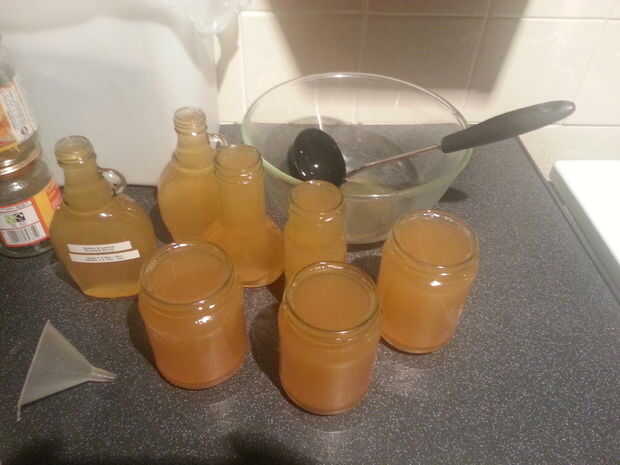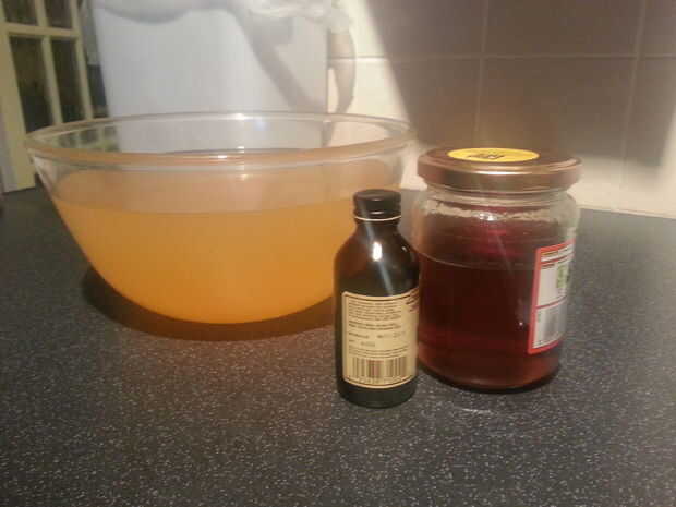 Al lote naranja agregué el resto de un tarro de miel y el conjunto de la segunda jarra (o al gusto; desea realmente dulce si desea diluirlo más adelante como hago, si va a tragar por la cucharada, o tal vez salpicar sobre el helado, no es necesario hacerlo tan dulce). También he añadido un poco de esencia de naranja para un sabor más intenso a naranja.