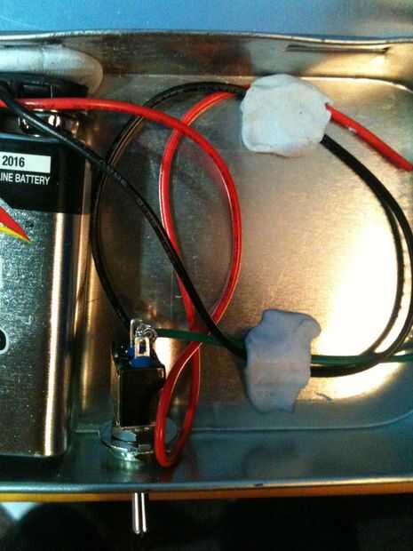 Primero obtener su resorte de pluma y de la soldadura de dos piezas de 20cm de alambre en los extremos de los resortes. Extremos de alambres uno con el interruptor y soldadura ahora un extremo del conector de la batería al interruptor después de la soldadura de la soldadura. Ahora los dos restantes cables y pegar los cables y conector de batería abajo I utilizado bluetack pero pegamento está bien yo también no la soldadura rosca los cables a través del éter forma está bien usted también necesitará perforar un agujero para el interruptor y luego apriete con un par de pinzas y calefacción