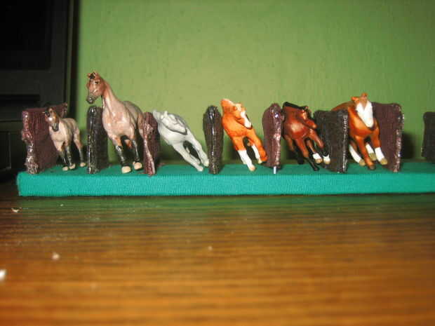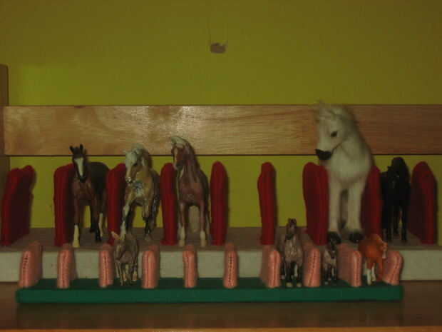 utilizar materiales comunes y artículos para el hogar para hacer un soporte rápido, barato y fácil para caballos modelo. Este titular evitará inclinar/caer/dominó mientras en pantalla en el hogar o en las demostraciones y protege sus ponis de frotaciones. Este instructable podría ser adaptado para todos los tamaños, pero aquí estoy haciendo los Micro Minis/Mini relincha y Stablemates/fichas. Usted puede personalizar su soporte para tamaño de modelo, número de "puestos" y los colores.
