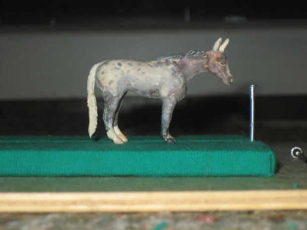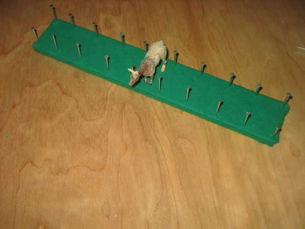 Asegúrese de que el espacio entre cada par de clavos es lo suficientemente grande como para acomodar los modelos que va a mostrar. Para mi micro minis, hice a intervalos de aproximadamente una pulgada. Para mi stablemates esto aumenté a una pulgada y media. Desea que el espacio para ser lo suficientemente grande como para acomodar diferentes caballos y tal vez caballos con tachuela así. Si el espacio es demasiado grande, sin embargo, el propósito del titular es derrotado porque un modelo que vuelca caerá totalmente sobre su lado y riesgo de daño.