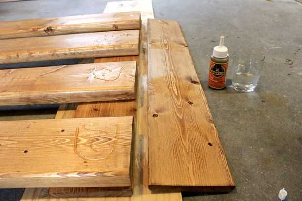 Una vez que todo está alineado, sacar el pegamento de madera se aplican a los bordes derecho de los cuatro 2 x 6 - luego tomar la otra 1 x 4 y la pongo encima de la cola - aplique algo de presión.