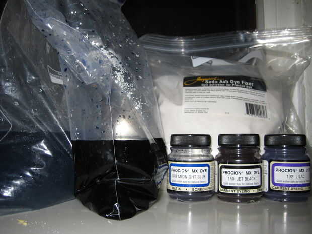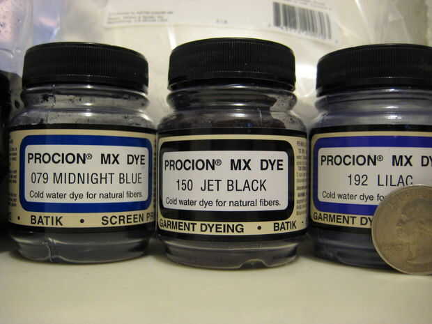 Agua fría tela tinte: polvo. $4 por botellita (3 cuartos (<--moneda de Estados Unidos) altura). 1 tablespoonish por bolso de la camiseta, se tinte una segunda camiseta, demasiado. por lo menos. Yo uso MX Procion.