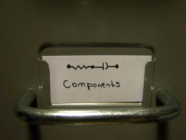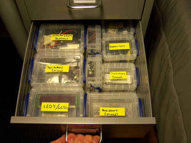 Aquí utilicé algunas "cajas realmente útil" (que es realmente su nombre) de grapas y Déjame decirte que son un ahorrador de vida! Simplemente paquete lleno de cosas de la misma clase y luego ponerlas en el cajón, también son fácilmente capaz de pila! no hay límite a lo que usted puede poner en ellos! (a menos que su demasiado grande por supuesto!). Mina son todas etiquetadas con lo que el nombre de los componentes que se encuentran en el lado, así es muy fácil de ubicar cada componente.
