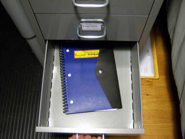 Aquí es donde usted puede guardar todos sus planes, esquemas, dibujos o notas rápidas. Me quedo con este bin simple por dejar mis "proyectos cuaderno" que todo lo que alguna vez he construido o imaginado contiene.