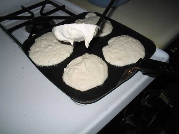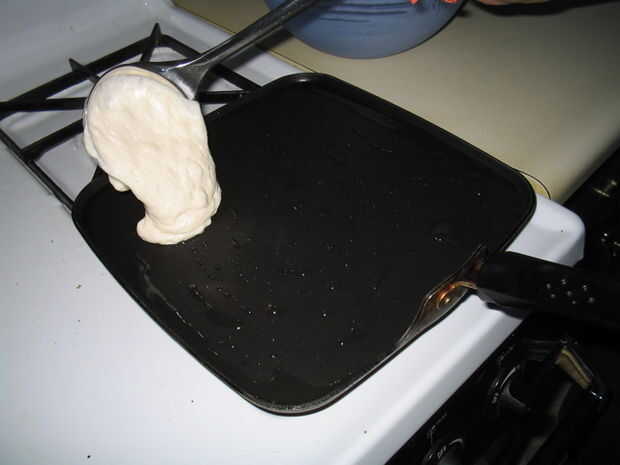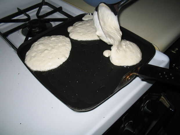 Con un cucharón de 1/3 taza (o 1/3 taza de medida), vierta 4 porciones en sentido horario alrededor de la plancha. Recuerde que la orden que vierte. Querrá dar la vuelta en el mismo orden.