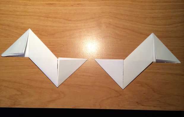 Gire los documentos boca abajo desde el último paso, como se muestra en la primera foto. Doblar las esquinas de los extremos cuadrados de cada papel hacia adentro para crear una forma que parece de dos triángulos pegados. A continuación doblar las esquinas exteriores hacia el interior para hacer paralelogramos.