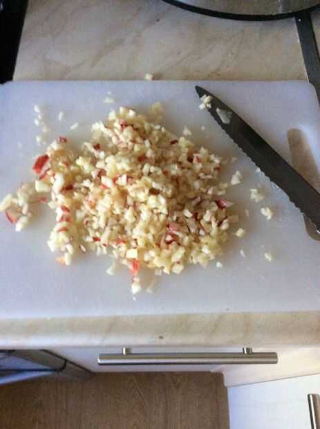 (Nota al cortar para arriba de las manzanas, cortar en cuartos y luego crear pilas pequeñas y mantienen corte. Echa un vistazo a la la imagen, muestra el tamaño correcto de piezas de Apple tendrá que tener)