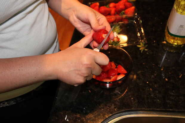 En un recipiente separado, corte para arriba alrededor de una docena de fresas (basta tener aproximadamente 3 tazas) ligeramente proceso de mezcla o comida. Pueden ser macizos, no quieres hacerlos puré. Debería hacer sólo un minuto en la batidora.