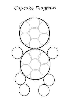 Usando el diagrama, arreglar cupcakes tamaño estándar para formar dos círculos, uno será la cabeza y el otro el cuerpo. Coloque dos cupcakes más a cada lado del cuerpo para las manos y alinee las dos para las piernas. Helada con el color deseado de glaseado y cubrir con habas de jalea en un color de coordinación. He usado betún azul turquesa y baya de la gomitas azules. Uso adicional gomitas para los ojos, dientes y uñas. Sea creativo y diviértase!