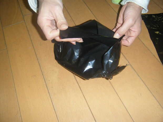 gire la bolsa (con los 2 nudos a cada lado) adentro hacia fuera