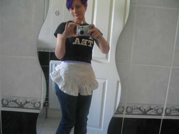 Usando la tela otra vez, añadir un hilo a la proa solo y cerrar la parte posterior con un tapón. Esto sería más fácil tener las pinny encendido y significa que usted no tendrá que cambiar la forma de la proa cada vez que te quitas la pinny.