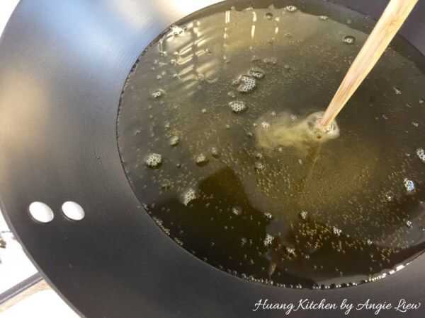 Paso 7: Calentar un wok de aceite medio a alto calor. Moje un palillo de madera en el aceite. Cuando el aceite está listo, aparecen pequeñas burbujas.