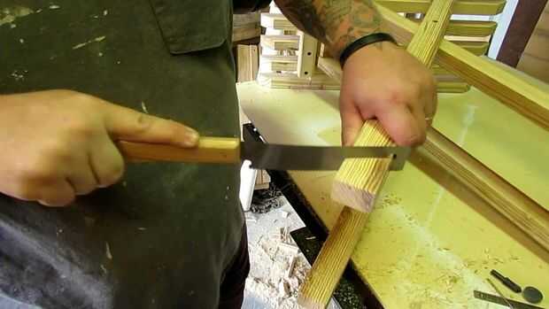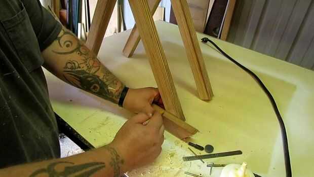 Una vez que tienes la parada de bloquear en su lugar, usted puede nivelar las patas. Hicimos esto colocando un trozo de madera plana sobre la mesa y luego dibujo una línea en toda la pierna. Esto nos dio el ángulo correcto que necesitábamos. Le cortamos el pedazo sobrante con un serrucho pequeño.