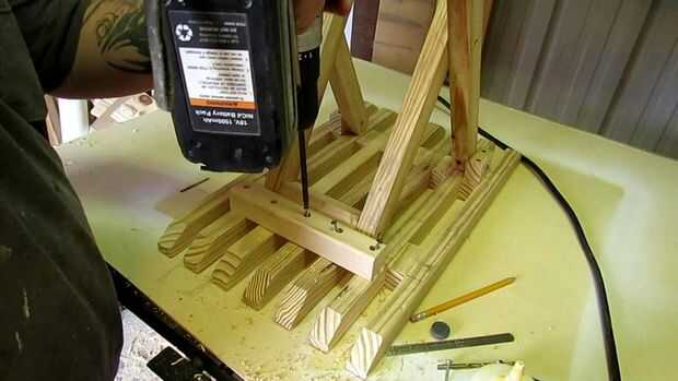 La próxima cosa a hacer es un bloque de tope. Se trata de una tira de madera que el conjunto de articulación de las patas reposará sobre. Este bloque consigue pegado y atornillado a la parte inferior de todas las bandas excepto los dos exteriores. La posición del bloque dependerá de lo ancho pones las piernas abrir.