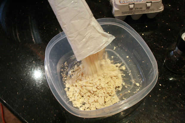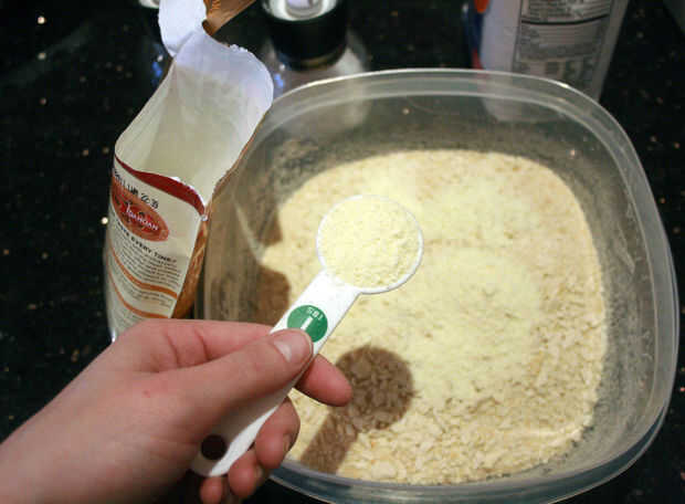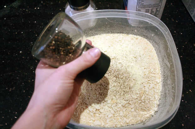 Mezclar el pan rallado con los copos de patata y condimentos.