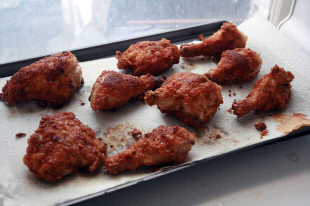 Usted puede mantener el pollo caliente en un horno caliente si es necesario freírlas hasta en lotes.  Este día hice tres pollos (ya que estábamos haciendo demos en Instructables HQ en cómo cortar para arriba) y se comió cada pieza!  Mi recomendación para hacer un super grande lote - use múltiples sartenes para freír.