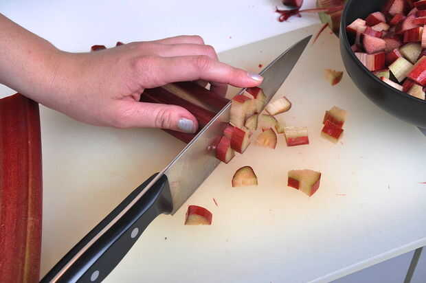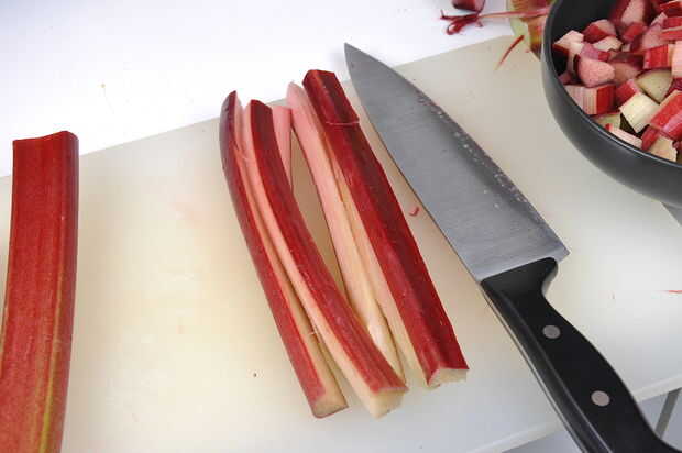 Primero lavar y cortar los extremos. Independientemente de sea almacén comprado para fresco, corte ambos extremos porque simplemente no sabes donde ha estado cada extremo. Cortar el ruibarbo longitudinalmente hasta que estén sobre el ancho que desee. Luego, simplemente córtalo en pequeños trozos.