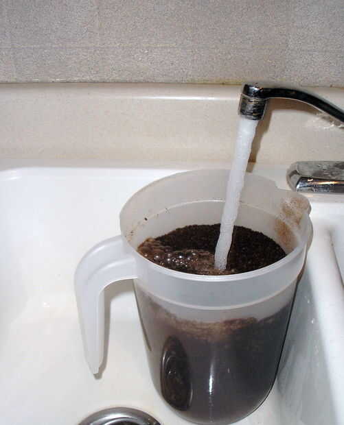 Ahora tienes una jarra de 1 galón con granos de café seco en la parte inferior. Llene la jarra con agua fría. Las tiendas de café utilice agua filtrada pero yo sólo uso antiguo Cleveland municipal agua!