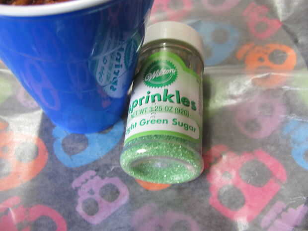 También usé unos sprinkles de azúcar verde. No tienes que usar chispitas, pero que quería hacer mío especial. Ahora es un buen momento para abrir los sprinkles, sólo tenga cuidado de no golpear por accidente.