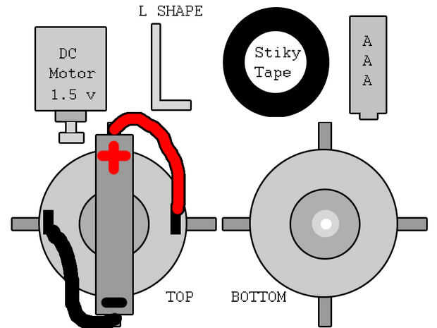 El objetivo es colocar la L en forma de objeto a los lados del motor frente a la unos a otros. mantener en su lugar con cinta adhesiva o pegamento caliente y coloque la batería en la parte superior como se muestra en la imagen. + - o- + hace no importa solo cambia el giro del motor.