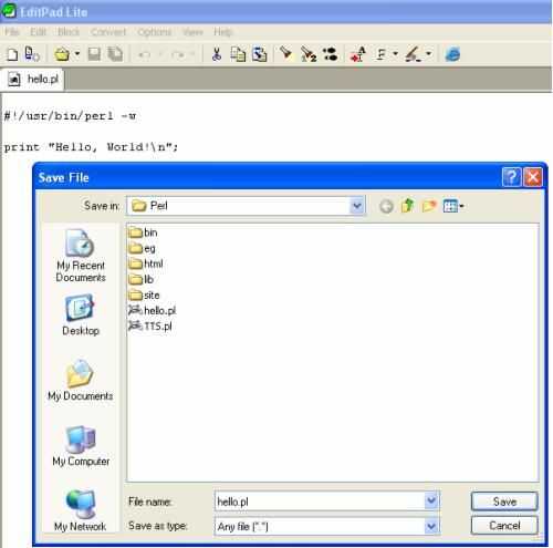 guardar como hello.pl (Asegúrese de guardarlo con .pl como la extensión, no hello.pl.txt).