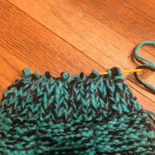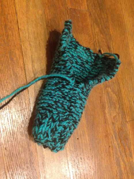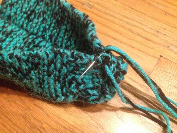 Cuidadosamente tire de una de las zapatillas de su aguja de tejer. a partir de los lazos más cercanos a de donde viene el hilo sobrante, tire del hilo a través de todos los lazos y tire firmemente. Se formará una forma de círculo. Mientras hace esto, asegúrese de que los cantos de "V" están en el exterior, y el sangrado es en el interior. Ahora el azote de la puntada hasta su deslizador que reúne a los dos bordes exteriores. Coser una longitud de aproximadamente 5 pulgadas desde el inicio del dedo del pie. Este nudo y corte. En algún momento dejo lo suficiente para hacer un arco poco aquí.